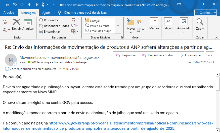 Acreditamos que tenham recebido um comunicado da ANP por e-mail com o título: “Envio das informações de movimentação de produtos à ANP sofrerá alterações a partir de agosto de 2025 — Agência Nacional do Petróleo, Gás Natural e Biocombustíveis.”